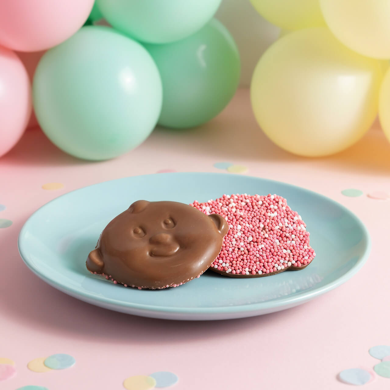 Leuke melkchocolade babysnoetjes met roze musket achterop. De snoetjes zijn zo’n 6 x 5 cm.