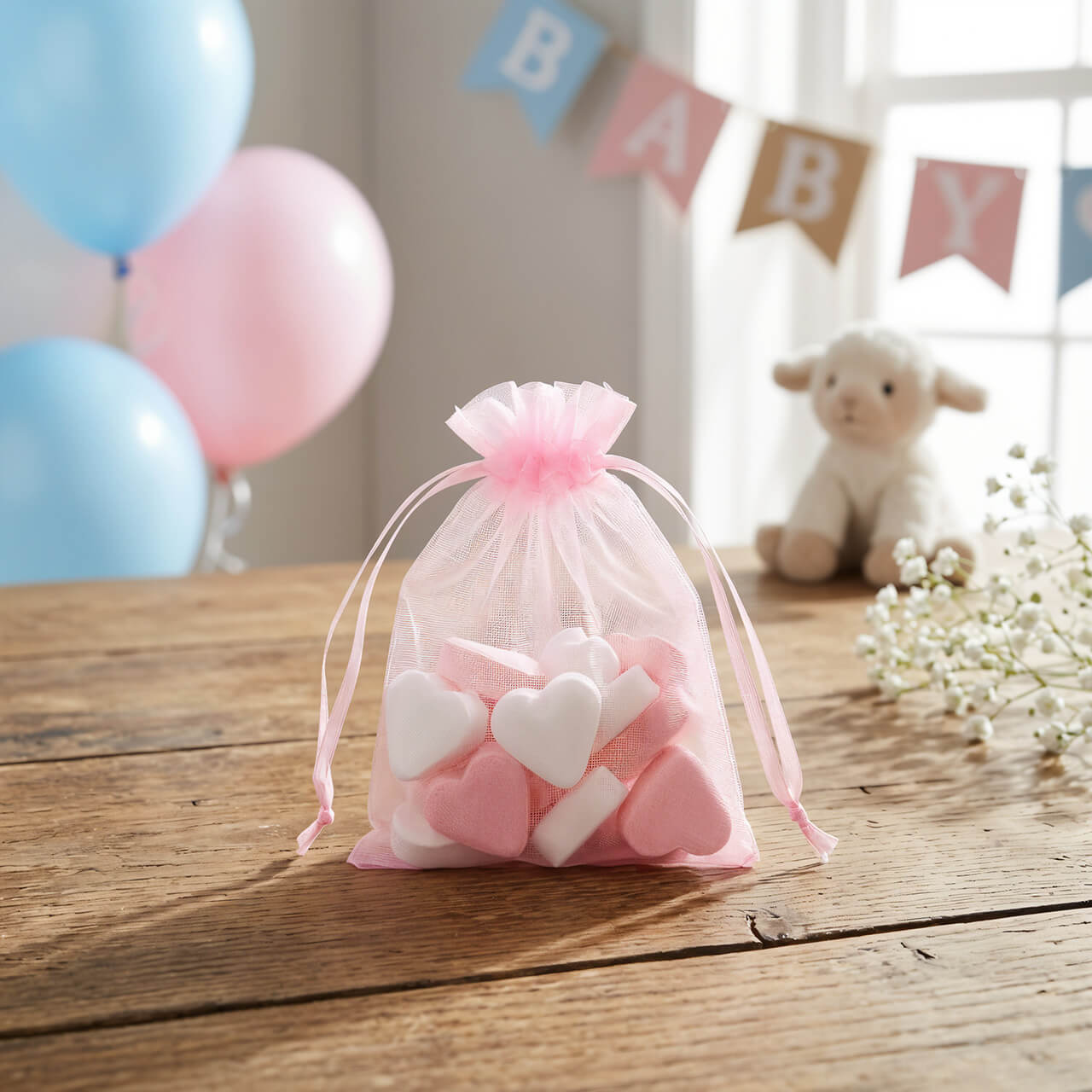 Vruchtenhartjes roze/wit in organza zakje. Per 1 stuk.